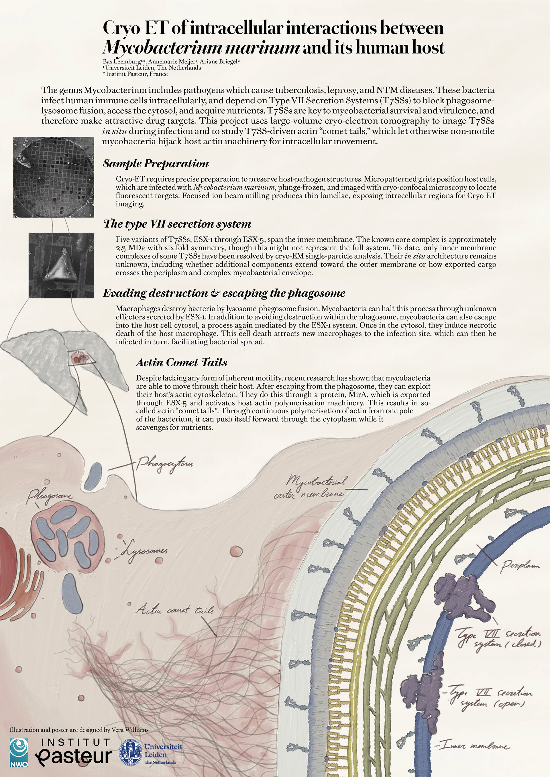 I designed an eye-catching poster for my colleague at the Institut Pasteur, Bas Leemburg, for his trip to Umeå in Sweden. The goal of this poster was to present his PhD work in an interesting way, so we opted for a design inspired by old-school botanical illustrations. For the illustration we focused on the molecular machinery he is researching, the Type VII secretion system and the host system he uses, Mycobacterium Marinum. We also added the actin comet tails that the bacterium forms to move inside its host system. In my eyes, the cherry on top is the addition of Bas' own handwriting to highlight interesting parts of the illustration.